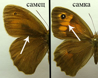 Андрокониальные пятна самцов на передних крыльях в виде широкого размытого поля. У самок сверху переднего крыла одно глазчатое пятно.MANIOLA JURTINA