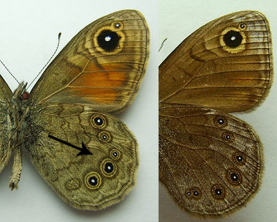 Снизу заднего крыла 5-6 четких глазков в 2-3 ободках.